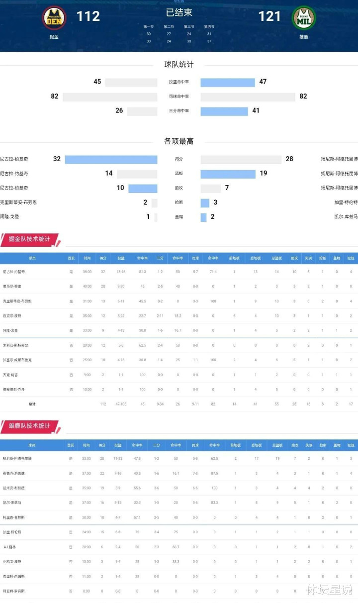 第四节,雄鹿队牢牢掌控着比赛节奏,最终以121:112战胜掘金队。掘金队的约基奇虽然拿下了32分14篮板10助攻的超级三双数据,但面对雄鹿队的整体防守和进攻火力,仍然难以力挽狂澜。穆雷虽然贡献了20分,但是整体效率不高,未能有效支援约基奇。阿隆·戈登的表现也相对平庸。